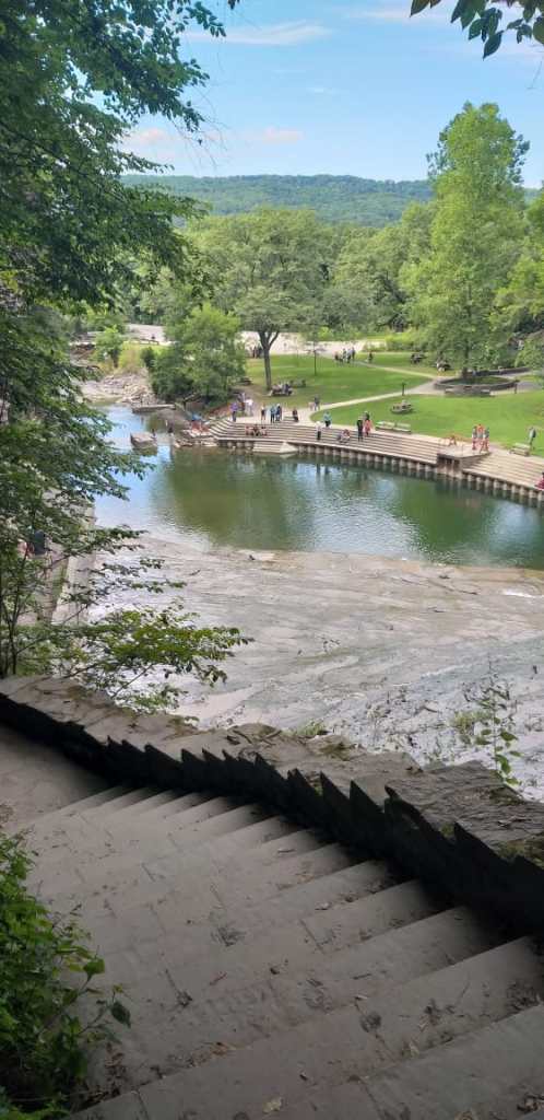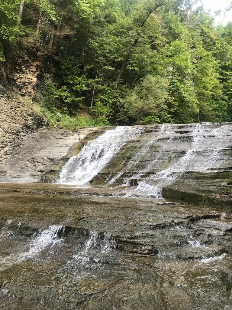 After enjoying our day at the trails and lazing in the waterfront of the breath-taking lake the whole afternoon we finally started heading back home. Looking at the places to visit on our list we still had lot many waterfalls to see, and the Buttermilk Waterfalls was en-route our destination. The winding roads with lush green trees covering on both sides and the lake beyond the trees made a perfect picturesque route to the falls. We promised ourselves that we would stop over for half an hour as we had a long drive back home, which was promptly forgotten once we saw the beautiful Buttermilk Falls cascading over and the scenic trails around. The parking lot at the state park was filled up, so we decided to park in an adjacent parking lot. The walk from the parking lot to the Falls had a picnic place within the woods. The short walk led us to a wooden bridge which gave us the full glimpse of the cascading waterfalls. After enjoying the beauty for a while, we started to hike through the rim of the creek. Every landing place which got us closer to the top of the waterfall was beautiful and with the rock and greenery on the side.
